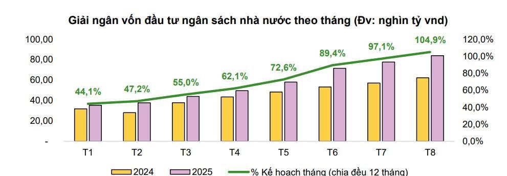 Chỉ tiêu Kết quả Ghi chú Giải ngân đầu tư công • Tháng 8: 83,8 nghìn tỷ đồng • 8 tháng đầu năm 2025: 463,2 nghìn tỷ đồng, bằng 48,3% kế hoạch năm, tăng 26,9% svck (cùng kỳ năm 2024 bằng 46,7% và tăng 2,5%) Tiến độ giải ngân đầu tư công tăng tốc rõ rệt. Nhiều công trình lớn được đưa vào khai thác, đã đủ điều kiện giải ngân ngay như: cao tốc Gia Nghĩa – Chơn Thành, TP. HCM – Mộc Bài, TP. Hồ Chí Minh - Thủ Dầu Một - Chơn Thành. Chính phủ đã khởi công hơn 250 dự án với tổng mức đầu tư 1,26 triệu tỷ đồng. Kỳ vọng tỷ lệ giải ngân sẽ đạt 60% vào quý III và hoàn thành 100% kế hoạch vào cuối năm 2025.