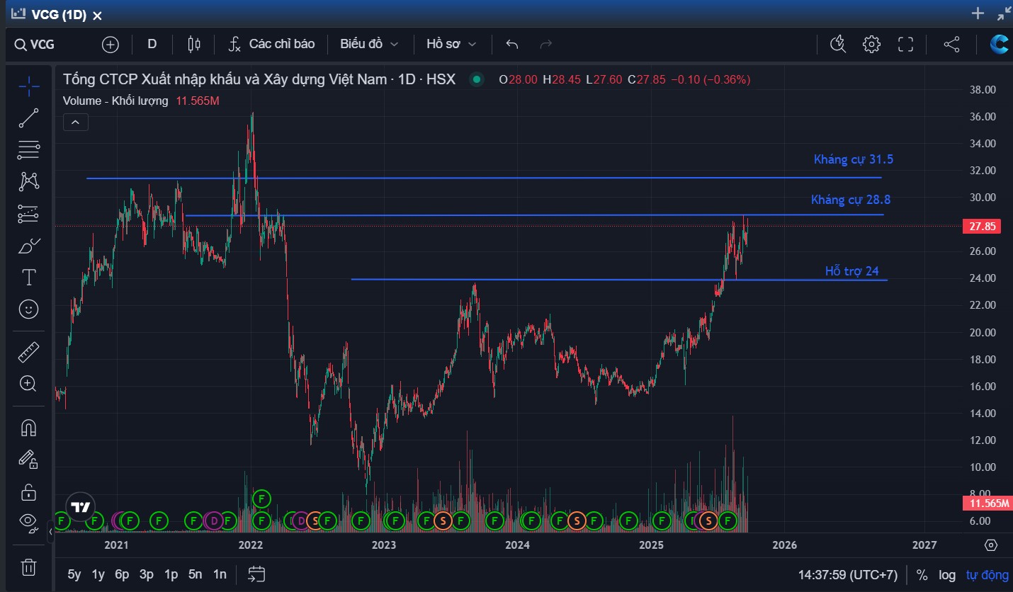 Sau khi tăng mạnh hơn 200% từ đáy, cổ phiếu VCG có thể gặp áp lực điều chỉnh ngắn hạn quanh vùng 28.500 – 32.500 đồng. Tuy nhiên, đây cũng là cơ hội để nhà đầu tư tích lũy cho tầm nhìn trung và dài hạn, nhờ triển vọng tăng trưởng doanh thu, lợi nhuận và dòng tiền từ bất động sản.