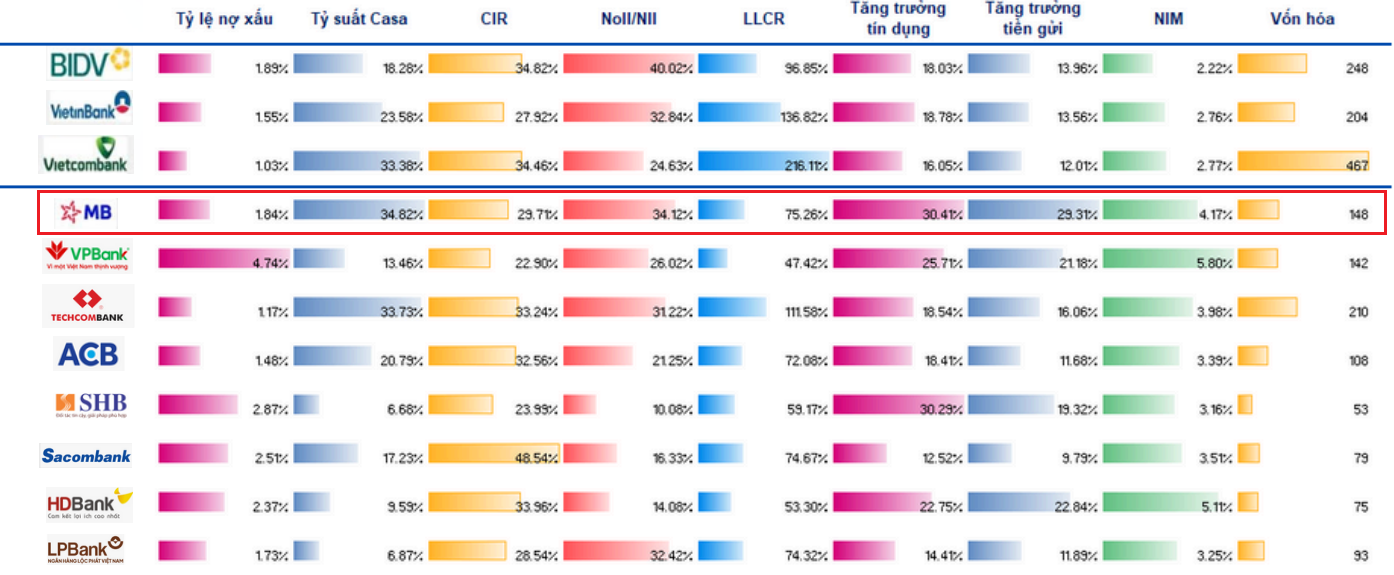 Tính đến cuối tháng 6/2025, tổng tài sản hợp nhất của MB vượt 1,29 triệu tỷ đồng; lợi nhuận trước thuế đạt 15.4 nghìn tỷ đồng, tăng 16.9% và hoàn thành tương đương gần 51% kế hoạch cả năm. Ước tính hết quý 2/2025, MBBank đạt hiệu quả ROE khoảng 22%, ROA 2,2% và CIR chỉ 24,3%, thuộc top trong Big5 ngân hàng tại Việt Nam. Tỷ lệ nợ xấu duy trì thấp khoảng 1.7% và hệ số dự phòng (LLR) dự báo duy trì khoảng 75% tương đương quý 1/2025 mặc dù áp lực quy mô nợ xấu toàn ngành đang tăng lên trong quý 2/2025, phản ánh năng lực kiểm soát chi phí và tối ưu nguồn lực trong bối cảnh kinh tế còn nhiều biến động. Thu nhập từ lãi của MBB dự báo tăng 21,66% nhờ tín dụng tiếp tục mở rộng.
